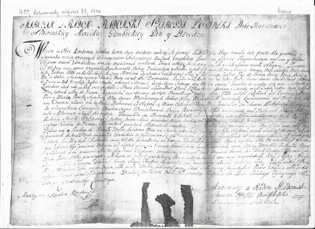 Martin von Radom Radomski on this date granted his Gembitzer Holländer a new privilege. The estate now comprised 27 ¾ full size farms. The size of both the Schoolmaster and Innkeeper farms were reduced to a half size farm each which was free of rent. Each full-size farmer could keep 50 sheep, on which a tithe of lamb was payable. The yearly rent was increased to 65 Tympfen per full farm. Woyciech Kienic (Albert Kienitz), Jan Bech (Johann Bech), Frydrych Bremer, and Krystyan Bene (Christian Benz) were to pay 5 Tympfen less in rent because their land was sandy and remote. In addition, 12 days of manual labor had to be performed annually for each full-size farm, and 2 bushels of oats and 2 chickens provided to the landlord. Since the Holländer were of the Protestant faith, they were permitted to have a Kantor read the Gospel. When the farmers rejected his harsh measures, Radomski drove away their livestock eventually forcing them to accept his new charter.