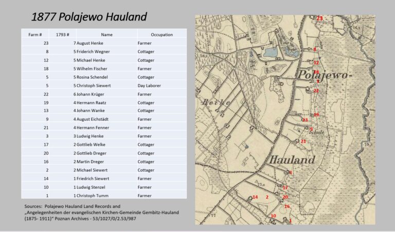 Following the division by the general Commission of Posen of the common lands of the Radomski Estate on July 22, 1854 the eight original properties consisted of the following acreage. Property Owner # Morgens Sq. Ruthen Gottlieb & Elisabeth Siewert 1 85 150 Martin & Caroline Wichner 2 87 91 Ludwig & Julianne Henke 3 … Continue reading The Partitions
